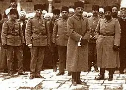 In the aftermath of the revolution, Niyazi and Enver remained in the political background due to their youth and junior military ranks with both agreeing that photographs of them would not be distributed to the general public; however, this decision was rarely honoured.[46] Instead, Niyazi and Enver as leaders of the revolution elevated their positions to near legendary status, with their images placed on postcards and distributed throughout the Ottoman state.[47][48] Toward the latter part of 1908, photographs of Niyazi and Enver had reached Constantinople and school children of the time played with masks on their faces that depicted the revolutionaries.[49] In other images produced at the same time, the sultan is presented in the centre, flanked by Niyazi and Enver to either side.[31] As the actions of both men carried the appearance of initiating the revolution, Niyazi, an Albanian, and Enver, a Turk, later received popular acclaim as "heroes of freedom" (hürriyet kahramanları) and symbolised Albanian-Turkish cooperation.[50][51]