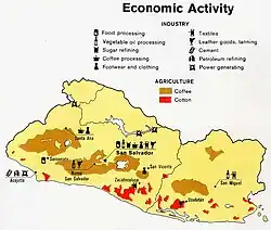 The southern range of mountains is actually a discontinuous chain of more than twenty volcanoes, clustered into five groups.[1] The westernmost group, near the Guatemalan border, contains Izalco and Santa Ana, which at 2,365 meters is the highest volcano in El Salvador.[1] Between the cones lie alluvial basins and rolling hills eroded from ash deposits.[1] The volcanic soil is rich, and much of El Salvador's coffee is planted on these slopes.[1]