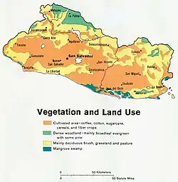 Two parallel mountain ranges cross El Salvador to the west with a central plateau between them and a narrow coastal plain hugging the Pacific.[1] These physical features divide the country into two physiographic regions.[1] The mountain ranges and central plateau, covering 85 percent of the land, comprise the interior highlands.[1] The remaining coastal plains are referred to as the Pacific lowlands.[1]