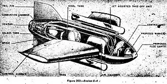 Dr. Herman Wurster of Messerschmitt proposed an answer in the form of Flak Rakete 1 (FR-1) in 1943. Instead of tracking down the planes, the rocket would fly just in front of the target and then detonate a 500 kg (1,100 lb) warhead, in the hope of bringing down several bombers at once.[2] With no human pilot on board, and thus no need to limit takeoff acceleration, the rocket could use solid fuel boosters (four Schmidding 109-553s, for a total of 7,000 kg (15,000 lb) of thrust, grouped around the exterior),[3] reducing the amount of fuel needed for the rest of the climb by the sustainer motor, a Walther RI-10B.[4] The liquid fueled sustainer used a combination of SV-Stoff and Br-Stoff (petrol), catalyzed by an amount of T-Stoff.[5] The result, even with the heavy warhead, was that a much smaller airframe was needed to carry the required fuel – so small it could be portable and launched from a modified 88 mm gun mounting.[6]