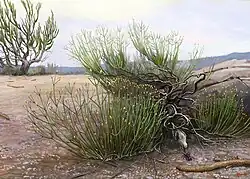 Ephedraceae is agreed to be the most basal group amongst extant gnetophytes. Members of the family typically grow as shrubs and have small, linear leaves that possess parallel veins. The fossil Ephedraceae genera show a range of morphologies transitional between the ancestral lax male and female reproductive structures and the highly compact reproductive structures typical of modern Ephedra.[3][4] Modern members of Ephedra have either dry winged membranous bracts (modified leaves which surround the seed), which are dispersed by wind, leathery covered seeds, which are dispersed by seed-eating rodents, or fleshy bracts which are consumed and then dispersed by birds. Some extinct members of Ephedra from the Early Cretaceous, such as Ephedra carnosa, as well as Arlenea from the Early Cretaceous of Brazil have fleshy bracts surrounding the seeds, suggesting that these seeds were dispersed by animals.[5]