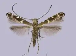 The wingspan is 5.7–7.5 mm. The forewings of the females are dark brown with a narrow white band on the dorsum from the base to 1/4 of the entire length, medially with a narrow white band extending from the costa to the dorsum and with a pair of narrow white bands beginning at the costal and dorsal margin near 2/3 of the wing and extending obliquely toward the wing apex, terminating before reaching mid-width of the wing. There is a narrow silver band with metallic reflection extending from the costa to the dorsum at 5/6 length and the distal 1/6 is brown with a black dot centrally. The distal end is fringed with a narrow white band and terminating with a narrow black band. The hindwings of the females are dark brown. The forewings of the males are brown with a narrow white band on the dorsum from the base to 2/3 of the entire length and with three pairs of narrow white bands beginning at the costal and dorsal margin near 1/2 to 3/4 length of the wing and extending obliquely toward the wing apex, terminating before reaching mid-width of the wing. There is a narrow silver band with metallic reflection extending from the costa to the dorsum at 5/6 length and the distal 1/6 is orange-brown with a black dot centrally, franked by a short white band near the dorsum. The distal end is fringed with a narrow white band and terminating with a narrow brown band. The hindwings of the males are brown.