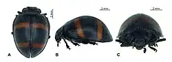 Adults reach a length of about 10 mm. Adults are black. The elytron is black with two transverse orange bands.[1]