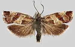 The wingspan is 12–15 mm. This moth has a characteristic wing pattern, with a pale brown ground colour and dark brown markings of the forewings, resembling a cross (hence the Latin name cruciana of the species).[3]