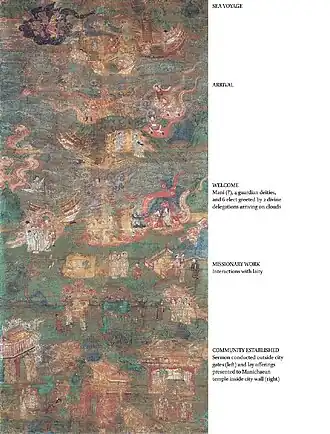 Episodes from Mani's Missionary Work is a Manichean silk color painting drawn in the coastal area of southern China during the yuan to ming period. It is now in a private Japanese collection. [1] The whole picture can be roughly divided into five scenes, depicting the missionary process of a Manichean elector. According to Hungary Asian religious art historian Zsuzsanna Gulácsi, this priest is probably the founder of Manichaeism Mani himself. [2] This painting was originally part of a large-scale Manichean silk painting. The drawing technique and artistic style are similar to "Mani's Community Established" and "Mani's Parents", "The Birth of Mani" and "Manichean Universe Map".