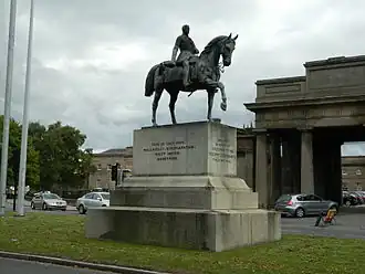 Stapleton Cotton, 1st Viscount Combermere (1773–1865) was a cavalry officer, diplomat and politician, who served with distinction under Wellington in the Peninsular War.[1] In 1863 it was suggested that a monument to him should be erected. The proposal quickly gained support from the major landowners of Cheshire and John Graham, Bishop of Chester, who were all major subscribers to the project. It was agreed, because of Combermere's distinguished cavalry career, that the monument should be an equestrian statue. Carlo Marochetti, noted for his equestrian statues, was commissioned to create the work. It was also agreed that the statue should stand on a prestigious site opposite Chester Castle. Work began in 1864 but, before the work could be completed, Combermere died in February 1865. The statue was unveiled on 26 October 1865 and cost about £5,000 (equivalent to £600,000 in 2023).[2] Around £7,000 had been raised from the subscriptions, and the difference was given to charitable causes. It was the first major piece of open-air public sculpture to be erected in Cheshire.[3]