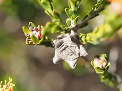 The flowers are orange-coloured, on the ends of the previous year's wood and occur singly or rarely, two together. There are 5 sepals which are densely hairy on the outside surface and 5 petals 4–6 millimetres (0.16–0.24 in) long. The stamens, which give the flower its colour, are arranged in 5 bundles, each containing 16 to 36 stamens. Flowering occurs from July to November and is followed by fruits which are woody capsules. The capsules are 6.9–8 millimetres (0.27–0.31 in) long, more or less cup-shaped, rough and lumpy with the remains of the sepals giving a star-like appearance to the end.[2] It can be distinguished from other eremaeas by the rough fruits and the presence of 5 or more veins on the leaves.