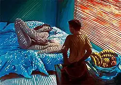 Fischl has embraced the description of himself as a painter of the suburbs, not generally considered appropriate subject matter prior to his generation.[10] Some of Fischl's earlier works have a theme of adolescent sexuality and voyeurism, such as Sleepwalker (1979) which depicts an adolescent boy masturbating into a children's pool. Bad Boy (1981) and Birthday Boy (1983) both depict young boys looking at older women shown in provocative poses on a bed. In Bad Boy, the subject is surreptitiously slipping his hand into a purse. In Birthday Boy, the child is depicted naked on the bed.