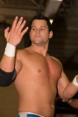 Later that year, in December, Edwards began teaming with fellow Sweet and Sour, Inc member, Davey Richards, as The American Wolves.[7] Their first match as a team was on December 26, at All Star Extravaganza IV, where they lost to The Briscoe Brothers (Jay and Mark) in a three-way elimination tag team match, which also involved Claudio Castagnoli and Nigel McGuinness.[44] The following night at Final Battle 2008, the American Wolves, along with Go Shiozaki, lost to Brent Albright, Roderick Strong, and Erick Stevens in a "New York City Street Fight". Later that night, they attacked and injured Mark Briscoe.[45] As 2009 began, they began challenging for the ROH World Tag Team Championship, losing to the champions Kevin Steen and El Generico on numerous occasions.[46][47] They eventually won the Championship on April 10, at a Ring of Honor Wrestling taping, in a "Tables are Legal" match.[48] Edwards and Richards went on to successfully defend the Championship against teams made up of ROH's top wrestlers including Tyler Black and Bryan Danielson, and against former champions Kevin Steen and El Generico at Manhattan Mayhem III in a submission match.