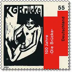 It is worthwhile to note that with the exception of one favorable review by Paul Fetcher in the leading Dresden newspaper Dresdner Neueste Nachrichten, the exhibition in Löbtau at the factory of the lamp manufacturer Max Seifert was considered to be a flop. In addition, Heckel's poster, no longer extant, had been barred from public display by the Dresden police.[6] In 1906 and 1907 the Die Brücke had another exhibition in Löbtau, devoted exclusively to graphics and including a group of woodcuts by Wassily Kandinsky. Unfortunately, the group once again failed to strike a chord with the public.[6] However, much more noteworthy and ironically also notorious, were the next three annual shows by the Die Brücke, this time held in the fashionable Emil Richter Gallery. In large, silent rooms, expensively furnished and smothered with lush carpets, the group's unconventional paintings and prints struck a foreseeably strident chord, amongst them notably a nude poster of a woman that ruffled many a complacent Dresdener.[6]