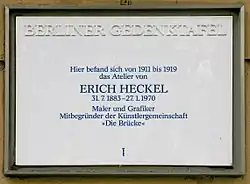 Heckel was born in Döbeln, Saxony, the son of a railway engineer. Between 1897 and 1904 he attended the Realgymnasium in Chemnitz, before studying architecture in Dresden. He left after three terms, shortly after the foundation of Die Brücke, an artists' group of which he was secretary and treasurer.[2] The other founder-members, also architectural students, were Ernst Ludwig Kirchner, Karl Schmidt-Rottluff and Fritz Bleyl.[3] He worked in the office of the architect Wilhelm Kreis until July 1907, when he resigned to become a full-time artist.[2]