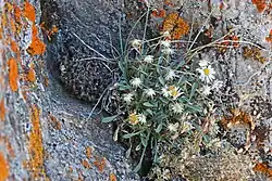 Erigeron cronquistii grows on ledges, cracks in cliff faces, and erosion pockets at high elevations in the mountains. It is a very small perennial herb rarely more than 7 cm (2.8 inches) tall, forming a taproot and sending up many shoots so that it forms a dense clump of stems. Each stem generally produces 1 or 2 flower heads, each head with 10-25 white or pale pink ray florets plus numerous yellow disc florets.[3]