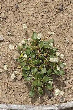 This is a small woody perennial reaching a maximum height and width of about 20 centimeters, including its inflorescence. Its rounded or spade-shaped, woolly (sometimes glabrous), petioled leaves are located at the base of the plant; their resemblance to the leaves of wintergreens (genus Pyrola) gives the species its name. The wool on the leaves and petioles sometimes has a pronounced orange color. Clusters of flowers appear on stalks which may be erect or bend to the ground. The small hairy flowers are greenish-white or white to pink.[1] At certain times during growth and blossoming this plant will emit an odor similar to sweaty, unwashed socks.[2][3]