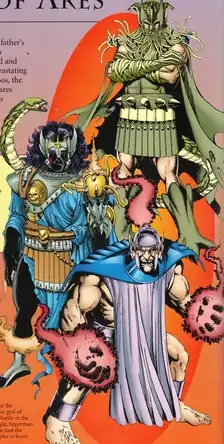 The Children of Ares are several fictional characters appearing in DC Comics publications and related media, commonly as recurring adversaries of the superhero Wonder Woman. Primarily based on eponymous Greek mythological figures, they are malevolent progeny of Wonder Woman's nemesis, the war god Ares. Three in particular – Deimos, Phobos and Eris – have emerged as enduring characters, appearing in every era of Wonder Woman's comic book adventures since debuting in 1969's Wonder Woman #183. Beginning in the Silver Age of Comic Books, these three characters have often been presented as Ares’ principal legates in his campaigns for universal conquest, and have also confronted Wonder Woman on their own, individually as well as with one another, as antagonists independent of their father.[1]