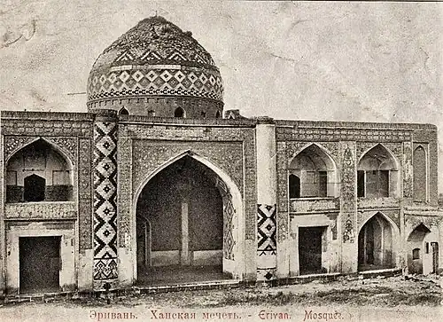 This mosque was Shia and was built in the beginning of the nineteenth century, during the reign of the last khan of Erivan Khanate Huseyn-khan. It was a Shia mosque, called “Abbas Mirza Jami”, named for the son of Huseyn-khan. The façade was covered by green and blue glass, usually found in Azeri-Iranian-style architecture. After the capture of Erivan by the Russians, the mosque was used as an arsenal.[10][11][12][13][14] During Soviet times the mosque, along with other religious structures (Armenian churches, temples and monasteries) was derelict and currently only the frame of the mosque has been preserved.[15][16]