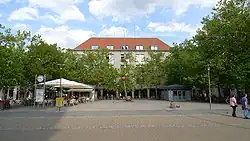 During the Second World War, 4.8% of Erlangen was destroyed by bombings; 445 flats were completely destroyed.[36] When the American troops moved in on 16 April 1945, the local commander of the German troops, Lieutenant Werner Lorleberg handed over the city without a fight, thus avoided a battle inside the city area that would have been pointless and costly. Lorleberg himself, who until the end was regarded as a supporter of the National Socialist regime, died at Thalermühle on the same day. Whether he was shot by German soldiers when he tried to persuade a scattered task force to give up, or whether he committed suicide there after the surrender message was delivered, has not been conclusively established. Lorlebergplatz in Erlangen, named after him, is a memorial to him. The text about Lorleberg, which is attached to it, refers to his death, which had saved Erlangen from destruction.