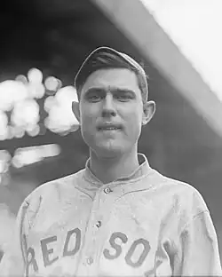 In his Red Sox debut against the Cleveland Naps on July 14, 1914, Shore pitched a complete game, allowing two hits.[11] For the Red Sox in the 1914 season, Shore won ten games and lost five, pitching to a 2.00 ERA.[12] Shore started the Red Sox' Opening Day game in 1915. During the 1915 season, Shore pitched to a 19–8 win–loss record and a 1.64 ERA.[13] The Red Sox won the American League pennant and faced the National League champion Philadelphia Phillies in the 1915 World Series. Shore started Game 1 for the Red Sox against Grover Cleveland Alexander, and lost by a score of 3–1.[4] The Red Sox won the next two games. Shore faced George Chalmers in Game 4, which the Red Sox won by a score of 2–1. The Red Sox won Game 5 to win the series.[1] Shore had a 2.12 ERA in 17 innings pitched in the series.[14]