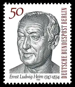 Ernst Ludwig Heim (22 July 1747 – 15 September 1834) was a German physician and naturalist born in Solz, Thuringia. He was popular for providing free medical treatment in Berlin. As a naturalist Heim influenced Alexander von Humboldt and Christian Konrad Sprengel.