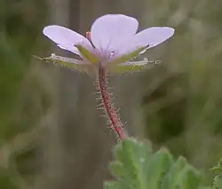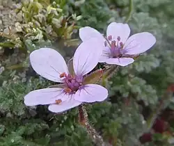 There can be several inflorescences, which are umbels of 2-4 (sometimes 5) actinomorphic flowers, arising from the tops of the branched stem. The flowers are supported by densely glandular-hairy pedicels about 1 cm long. They are hermaphroditic, with 5 glandular-hairy sepals a few millimetres long and 5 white to pinkish petals 5 mm long. There are also five stamens and five carpels, which develop into fruits that look like a miniature storks bill. Each fruit is a schizocarp which breaks into 5 mericarps, each of which has a short (5 mm) basal segment containing one black seed, and a long (20 mm) beak that splits open at maturity to reveal a feathery appendage that enables the seeds to be dispersed by the wind. At the top of the basal segment there is a large, shallow pit that (unlike common stork's-bill) is not surrounded by a ridge and groove, but is partially covered by the long white hairs on the body of the mericarp.[1][2][3]
