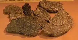 In World War II, Ersatzbrot (substitute bread) made of potato starch, frequently stretched with extenders such as sawdust, was furnished to soldiers as Kommissbrot, a dark German bread baked from rye and other flours used for military rations,[5][6] and also to prisoners of war.[7][8][9] One recipe reportedly discovered in the "Food Providing Ministry" (Reichsnährstand) in Berlin, labeled "(Top Secret) Berlin 24.X1 1941", contained 50% bruised rye grain, 20% sliced sugar beets, 20% "tree flour" (sawdust), and 10% minced leaves and straw.[7]