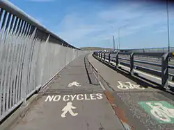 The bridge is one of Scotland's most notorious suicide spots: estimates suggest that more than fifteen people commit suicide there each year.[34][35][36][37][38][39][40] This has led to the Samaritans charity placing signs at each path leading onto the bridge and also within four public telephone boxes that are situated on the twin footpaths running adjacent to the roadway on either side of the river. There are also normal SOS phones as seen on motorways nationwide. The bridge was brought into the media spotlight again after the death of two teenage girls who absconded from a nearby secure unit.[41][42][43] In September 2011, work started to install suicide barriers along the length of the bridge to prevent future suicide attempts. Installation of the new barriers was completed by Amey Highways at a cost of £3.5 million.[44] The vehicle barriers are also being upgraded. The new barriers being installed are H4a High Containment Vehicle Barriers. These works will also see the towers and the suspension cables being re-painted. Stage one of this upgrade started on 15 July 2013 and is scheduled to last for 12 months. Highway Barrier Solutions are undertaking the upgrade which will cost £6 million and whilst ongoing the traffic is being monitored by Bluetooth technology. There are detectors on the bridge entry points which feed live traffic reports to the Traffic Scotland website.[45]