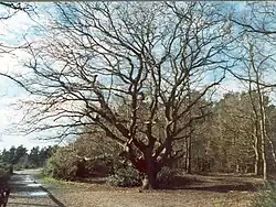 The Common was not always wooded, and much of the area was formerly open heathland used as common grazing land. It had not been grazed for many years and much of the area is now secondary woodland, including conifer plantations from the 1950s. Grazing trials began on a small area of Esher Commons in 2015. In the first year 15 goats were introduced to a 2.5ha area of heath for a period of six months.[9] Esher Commons Site of Special Scientific Interest covers a large part of Arbrook, Esher, Oxshott, West End and Fairmile Commons and the Ledges. Arbrook Common is the easternmost, named after the Arbrook, at other points and sources known as the 'Rythe'. Otherwise much of the remainder of the commons is a subterranean aquifer.[10][11] A programme to fell tracts of secondary woodland has led to various public protests.[12] In spite of the SSSI designation, the A3 Esher bypass was built through the middle of Esher Common in 1974. As compensation, approximately 90 acres (360,000 m2) of "exchange land" became part of the Commons. The Ledges were added to West End Common, and an area including Middle Pond became part of Esher Common.