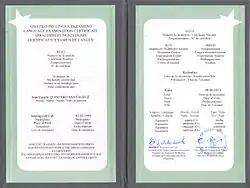 In addition to textbooks, including the Fundamento de Esperanto by Zamenhof, the Assimil-methods and the video-methods such as Muzzy in Gondoland of the BBC and Pasporto al la tuta mondo, there are many courses for learning online. Moreover, some universities teach Esperanto, and the Higher Foreign Language training (University Eötvös Loránd) delivers certificates in accordance with the Common European Framework of Reference for Languages (CEFR).[8] More than 1600 people have such a certificate around the world: in 2014 around 470 at the level of B1, 510 at the level of B2 and 700 for C1.[9] The International League of Esperanto Teachers (ILEI) is also working to publish learning materials for teachers.