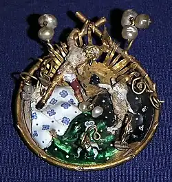 - ^ Birgitta Falk, "Die sechzehn französisch-burgundischen Agraffen im Essener Domschatz", in Birgitta Falk, Thomas Schilp, Michael Schlagheck (edd.): ... wie das Gold den Augen leuchtet. Schätze aus dem Essener Frauenstift (= Essener Forschungen zum Frauenstift. Bd. 5). Klartext-Verlag, Essen 2007, ISBN 978-3-89861-786-4, pp. 215–241; Susanne Conrad, "16 Agraffen aus dem Essener Domschatz", in Jahrbuch der rheinischen Denkmalpflege 42, 2011, pp. 240–243.