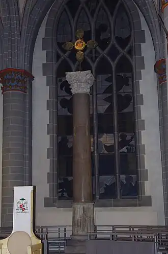 The oldest surviving fitting in the minster is the column in the choir, which now supports a modern crucifix. Until the fifteenth century it supported a cross coated with a gilt copper sheet, from which the donation plate and probably other remains in the cathedral treasury were made. The Latin inscription ISTAM CRUCEM (I)DA ABBATISSA FIERI IUSSIT (Abbess Ida ordered this cross to be made) allows the creator to be identified with the Essen Abbess Ida, who died in 971, though the sister of Abbess Theophanu, Ida, Abbess of St. Maria im Kapitol in Cologne, has also been suggested. The column itself is probably ancient spolia, going by fluted pedestal and the Attic basis of the column. The capital was carved in antiquity, though exceptionally richly carved for that period. Stylistically it is related to the capitals of the west end and the crypt, as well as those of the Ludgeridan crypt of Werden Abbey and those of St Lucius's Church in Essen-Werden.