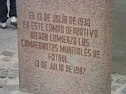 Due to various factors, it is considered a historical stadium.[6][7][8] Built in 1900, it is the oldest current stadium in America and the fifteenth in the world.[9][10] But it mainly stands out for having hosted the 1930 FIFA World Cup opening match, one of the first two matches in the history of the competition, when on 13 July 1930 United States defeated Belgium 3–0 in Group D. FIFA remembered this fact when in 2005 a delegation headed by its president, Joseph Blatter,[11] came to visit the reforms and placed a commemorative plaque at the stadium. This historical fact was remembered by FIFA on two occasions: 1987 and 2005.[12]
