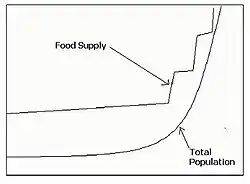 This graph shows how the rate of food supply may vary but never reaches its carrying capacity, because every time it gets near, there is an invention or development that causes the food supply to increase.