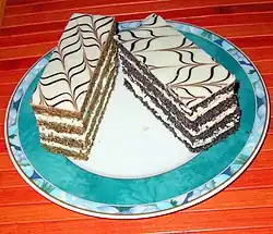 Esterházy torta consists of buttercream spiced with cognac or vanilla, sandwiched between four and five layers of almond meringue (macaron) dough.[2] The torte is iced with a fondant glaze and decorated with a characteristic chocolate striped pattern.[3] There are, however, many different recipe variations. In Hungary, the original almonds have been entirely replaced by walnuts.[4]
