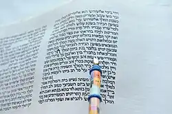 First chapter of a hand-written scroll of the Book of Esther, with reader's pointer. | |