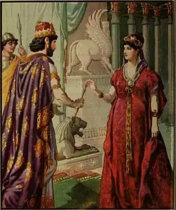 Esther 5 is the fifth chapter of the Book of Esther in the Hebrew Bible or the Old Testament of the Christian Bible,[1] The author of the book is unknown and modern scholars have established that the final stage of the Hebrew text would have been formed by the second century BCE.[2] Chapters 3 to 8 contain the nine scenes that form the complication in the book.[3] This chapter records that Esther's risky behavior to appear uninvited before the king Ahasuerus is richly rewarded, because the king generously offers to give her whatever she wants, 'even to the half of my kingdom' (5:3), but Esther cleverly asks for nothing more than an opportunity to entertain her husband and his chief officer, Haman.[4] Both men were pleased at her hospitality, but when the king again offers her half the empire, this time she requests only a second banquet.[4] While Haman was happy to have been entertained by the queen, he became intensely distressed when Mordecai once more refused to bow down before him.[4] Haman's wife, Zeresh, advised him to erect a monumental gallows intended for Mordecai, and only then Haman felt happy again to look forward to Esther's second banquet.[4]