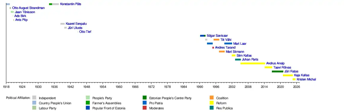 | Prime Minister of the Provisional Government | 12 November 1918 | 27 November 1918 | Päts II Provisional EMRL–ETE–EDE EMRL–ETE–EDE–ESDTP [Note 1] | ||||||