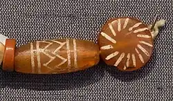 Etched carnelian beads, or sometimes bleached carnelian beads, are a type of ancient decorative bead made from carnelian with an etched design in white, which were probably manufactured by the Indus Valley Civilization during the 3rd millennium BCE. They were made according to a technique of alkaline-etching developed by the Harappans, and vast quantities of these beads were found in the archaeological sites of the Indus Valley civilization.[2][1][3][4] They are considered as an important marker of ancient trade between the Indus Valley, Mesopotamia, and Ancient Egypt, as these precious and unique manufactured items circulated in great numbers between these geographical areas during the 3rd millennium BCE, and have been found in numerous tomb deposits.[5]