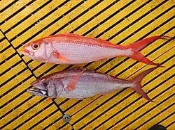 Etelis coruscans, commonly known as the longtail snapper or deep-water red snapper, is a species of snapper found in the Pacific and Indian oceans.[2] It is a valuable commercial species, and lives quite deep โ from 210 to 300 m (690 to 980 ft). It is a long-lived species that grows and matures slowly.[3] In Hawai'i the fish is widely known as onaga. When eaten, it has a mild flavour and pale pink flesh. Onaga pictured top. [4]