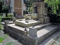 Forced to quit the stage in 1935 following a severe attack of angina pectoris, he died aged 52, in Rome, on 29 June 1936.[6][n 2] The corpse, dressed in a tailcoat of his celebrated character Gastone, was buried at the Cemetery of Verano. On 19 July 1943, during the first bombing of Rome, his tomb – a rectangular chapel – was hit, breaking the marble bust and severely damaging the coffin containing the remains of the actor. The renovated tomb bears the epitaph "Dalla bocca tua cantò l'anima di Roma" ("The soul of Rome sang from your mouth").[n 3] [24]