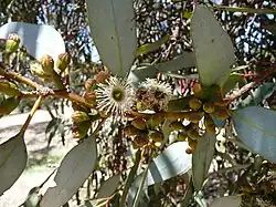 Adult leaves are the same dull bluish green to greyish green on both sides, lance-shaped to curved, 48–120 mm (1.9–4.7 in) long and 8–25 mm (0.31–0.98 in) wide on a petiole 8–25 mm (0.31–0.98 in) long. The flower buds are arranged in leaf axils in groups of seven on a peduncle 5–20 mm (0.20–0.79 in) long, the individual buds on a pedicel 2–5 mm (0.079–0.197 in) long. Mature buds are cylindrical, green or red, 6–11 mm (0.24–0.43 in) long and 3–5 mm (0.12–0.20 in) wide with a conical to turban-shaped, striated operculum. Flowering occurs from late summer to mid autumn and the flowers are white. The fruit is a woody, cup-shaped to cylindrical or barrel-shaped capsule 4–9 mm (0.16–0.35 in) long and 5–7 mm (0.20–0.28 in) wide.[3][4][5][6][7][8]