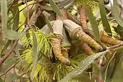 It produces large yellow-green flowers that occur from July to October in the species' native range.[3] Each simple, axillary conflorescence is made up of three to seven flowered umbellasters on broadly flattened peduncles.[4] The fruits or capsules are clustered and sessile on a flattened peduncle. They have a campanulate shape with one prominent rib with many weak ribs. The capsules are 1.8 to 4 centimetres (0.7 to 1.6 in) in length and 2.2 to 2.5 cm (0.9 to 1.0 in) wide with three exserted valves.[5]