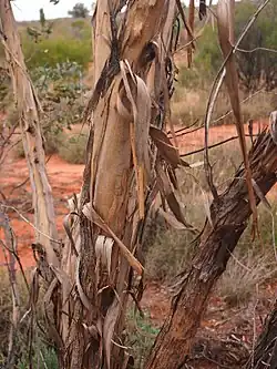 It is one of the most widespread mallee species in Australia.[18] In Western Australia it is found on calcareous flats and rocky scree slopes in the Pilbara and Goldfields-Esperance regions where it grows in red-grey loam over limestone.[6] It is also found through much of South Australia, particularly in southern areas such as the Eyre Peninsula, Gawler Range, Flinders Ranges and Adelaide foothills where it is common.[19] The range extends into the southern part of the Northern Territory, where it is found in the Alice Springs region[20] and into parts of Queensland where it is found in open woodlands, where it often occurs with E. dumosa, E. gracilis and E. leptophylla.[21] In New South Wales it is found west from Condoblin with a sporadic distribution from Wilcannia. In these areas it is found in mallee shrubland communities on red aeolian sands.[2] In Victoria it is found in the north west of the state.[3]