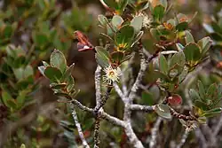 Eucalyptus vernicosa is endemic to Tasmania, and is only found in alpine regions in the west to southwest, including Cradle Mountain.[5] It grows between 700m and 1350m above sea level, usually on peaty acid soils on top of quartzite or sandstone bedrock.[3][11] It is usually found above the tree line, and can be a dominant component of alpine heath communities, along with Richea, Athrotaxis, and Orites.[12] This habitat typically has high average rainfall varying from 1000mm to 2500mm per year, and very cold winters with continuous frosts and snow for several months.[4] The harsh climate and nutritiously poor soils probably explain the small size and tough leaves.[13]