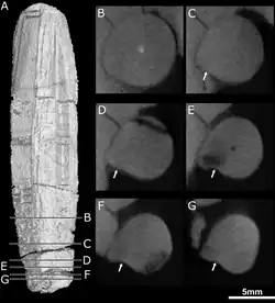 CT scanning shows that the openings of E. mirabilis lead to canals that connect to the trigeminal nerve, which controls facial sensitivity. The forward-directed canal also splits into the three main branches of the infraorbital nerve,[14] all of which connect to the socket of the canine; the junction occurs about 3–6 millimetres (0.12–0.24 in) along the canal, another point of variation between the two skulls. The top branch, the external nasal ramus, splits into four branches in the type skull, but it does not split in the second skull. In other therapsids like Thrinaxodon, Bauria, and Olivierosuchus, the external nasal ramus generally splits into three or more branches. All of these canals would have brought nerves and nutrient-rich tissue to the root of the canines and the rest of the upper jaw.[2][14]