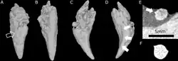 The type specimen of E. mirabilis preserves the right canine.[2] Like other therocephalians, its canine was very large, resulting in a specialized predatory lifestyle that incorporates a sabertooth bite into prey killing.[9] It is round in cross-section,[3] and bears a prominent ridge on the side of its front surface. Immediately beside this ridge is a shallow depression that becomes wider near the top of the tooth, which is probably the same structure as the groove interpreted by some authors.[2][10] Unlike E. mirabilis, however, the canines of E. liuyudongi had neither ridges nor grooves.[6] Theriodonts usually replace their teeth in an alternating[11] (or distichial) pattern,[12][13] such that the canine tooth is always functional; both skulls of E. mirabilis show no sign of any replacement canines developing, suggesting that it was reliant on having both canines present and functional simultaneously.[2]