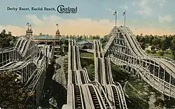 ![]() Euclid Beach post card, circa 1915, featuring the roller coaster Derby Racer (later renamed the Racing Coaster) | |