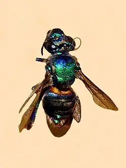 Euglossa cordata is a primitively eusocial orchid bee of the American tropics.[2] The species is known for its green body color and ability to fly distances of over 50 km. Males mostly disperse and leave their home nests, while females have been observed to possess philopatric behavior.[3] Because of this, sightings are rare and little is known about the species.[4] However, it has been observed that adults who pollinate certain species of orchids will become intoxicated during the pollination.[5]