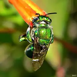 Green orchid bees are varying shades of glossy metallic green and can grow to a length of about 1.3 cm (0.5 in). The membranous wings are dark-coloured and translucent and the female has pollen baskets on her hind legs. The male has an enlarged joint on his hind leg where there is a pit for storing substances he gathers from plants. The female but not the male possesses a sting which can be used on more than one occasion but which is not as painful to humans as a honeybee's sting. This bee is very agile in the air, hovering for lengthy periods and darting between flowers. It might be confused with sweat bees in the family Halictidae, such as Augochloropsis, but orchid bees have much longer proboscises in order to gather nectar from flowers with long corolla tubes.[1]