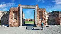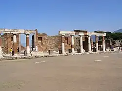 Ruins of the building funded by Eumachia, with portions of the inscription visible on the horizontal light-colored stone