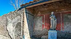 The building as a whole is dedicated to Augustian Concord and Piety, thought to be in the image if Livia, one of the first women in Pompeii to have their own honorific statues.[9] In front of the building, there are bases of what were once statues of Romulus and Aeneas. Paintings of the street of Abundance, where the building is located, show Aeneas leading his family from Troy and Romulus holding a Spolia opima. In front of the building, there are bases of what were once statues of Romulus and Aeneas. Paintings of the street of Abundance, where the building is located, show Aeneas leading his family from Troy and Romulus holding a Spolia opima.[10]