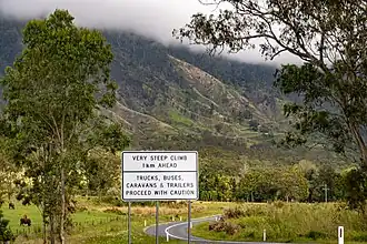 The locality was within the proclaimed boundaries of the Eungella Goldfield at the end of the 1800s and early 1900s. Access to the area was by a pack horse track or by a road via Nebo and Mount Britton.[5][6] The Eungella Range Road opened in 1909.[7] However damage had been incurred within twelve months, and repairs and a deviation instigated.[8] In 1923 the first car traveled on the Eungella Range in wet slippery conditions, and resorted to tying a heavy sapling behind the car to steady the car.[9] Landslips continue to be an issue following heavy rain.[10]
